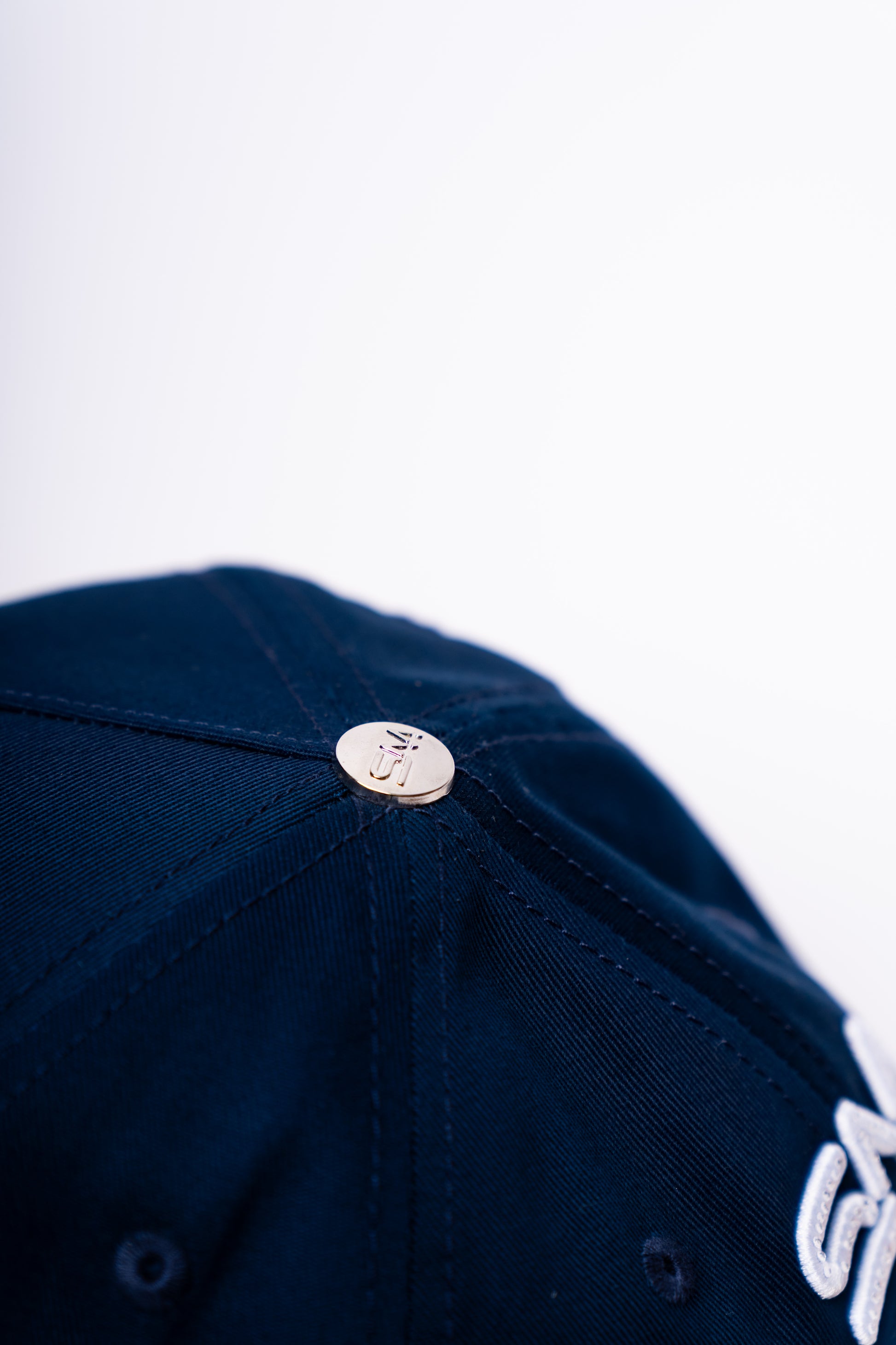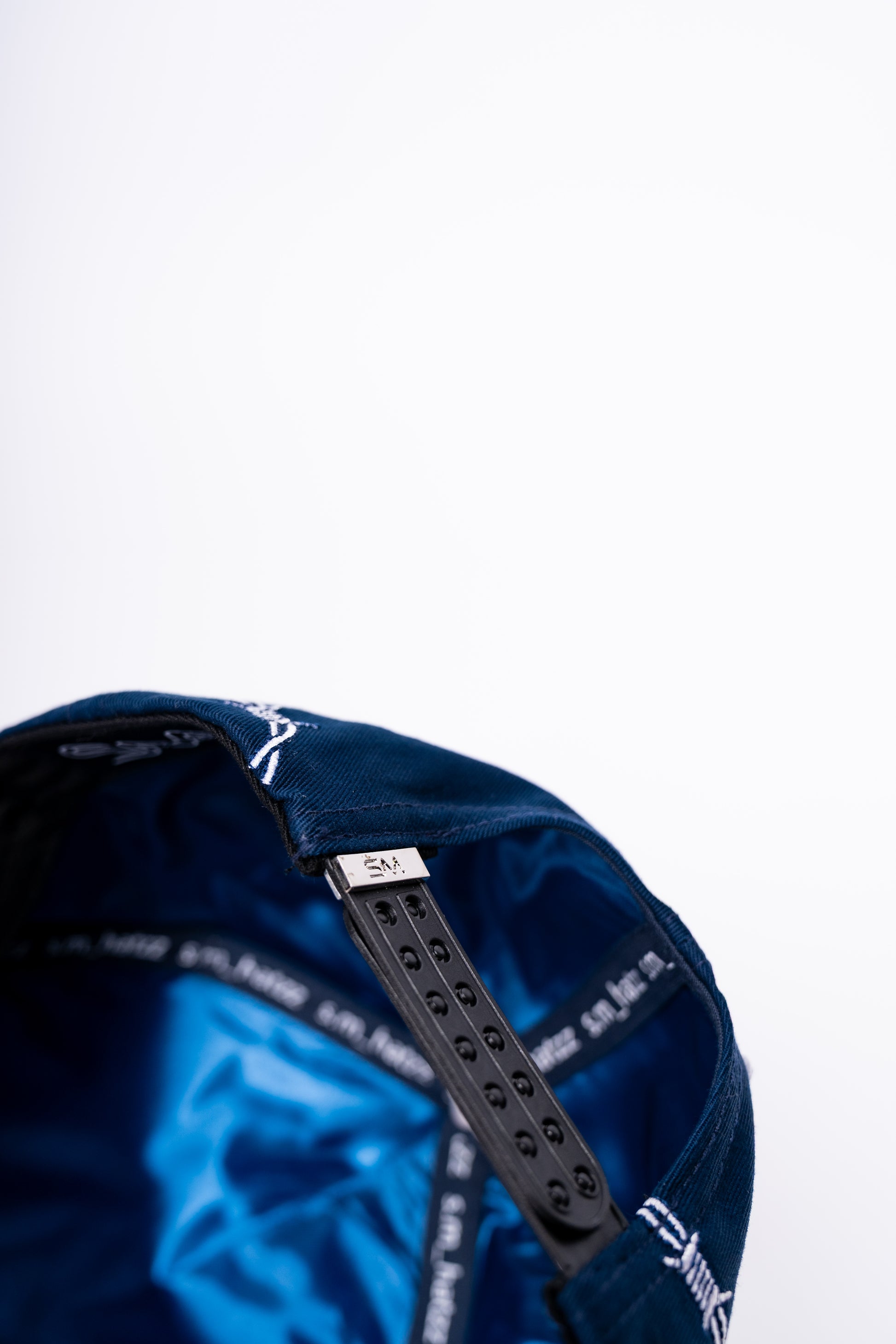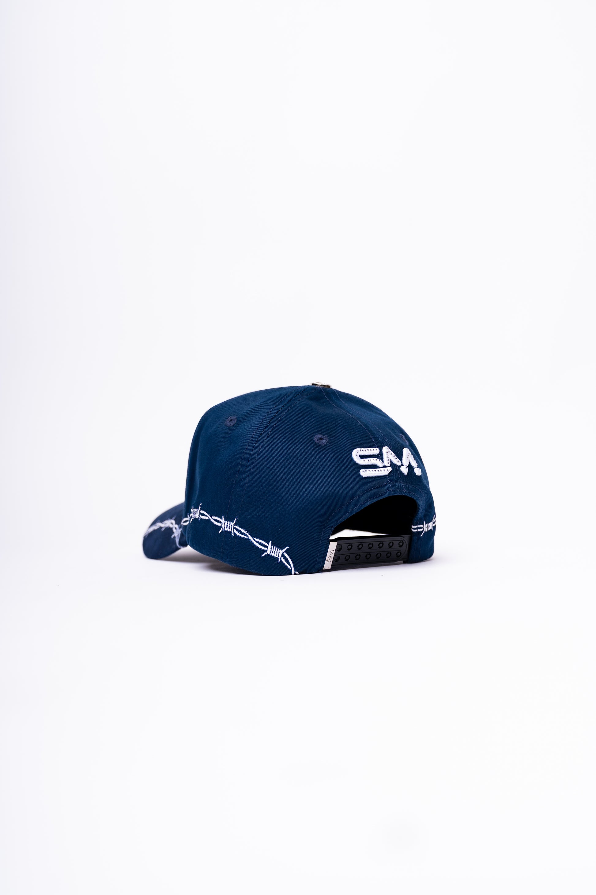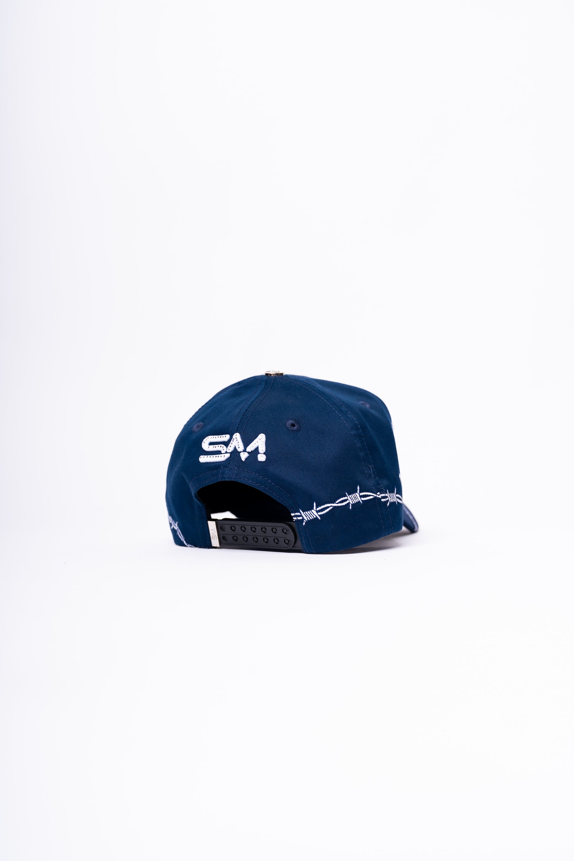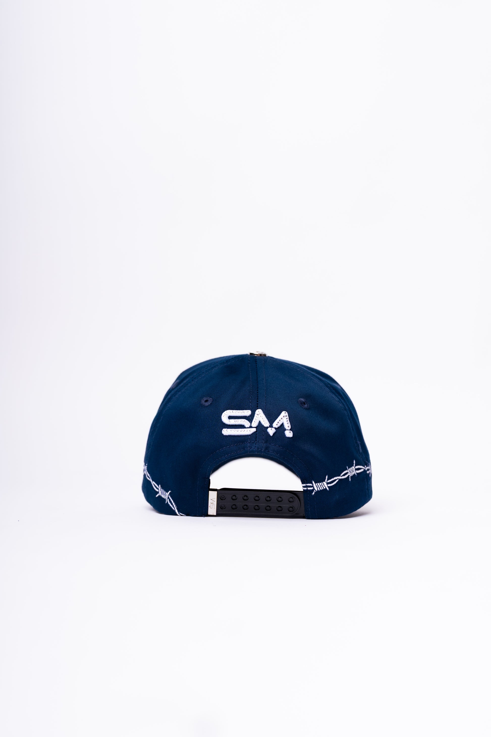 NY BARBED WINGS- V2 In Blue (3D puff embroidery, metal SM button, Rhinestone, 2D Embroidery, Satin Interior, Leather SM patch under brim, suede material on brim, cotton cap, double row SnapBack, metal SM tag)