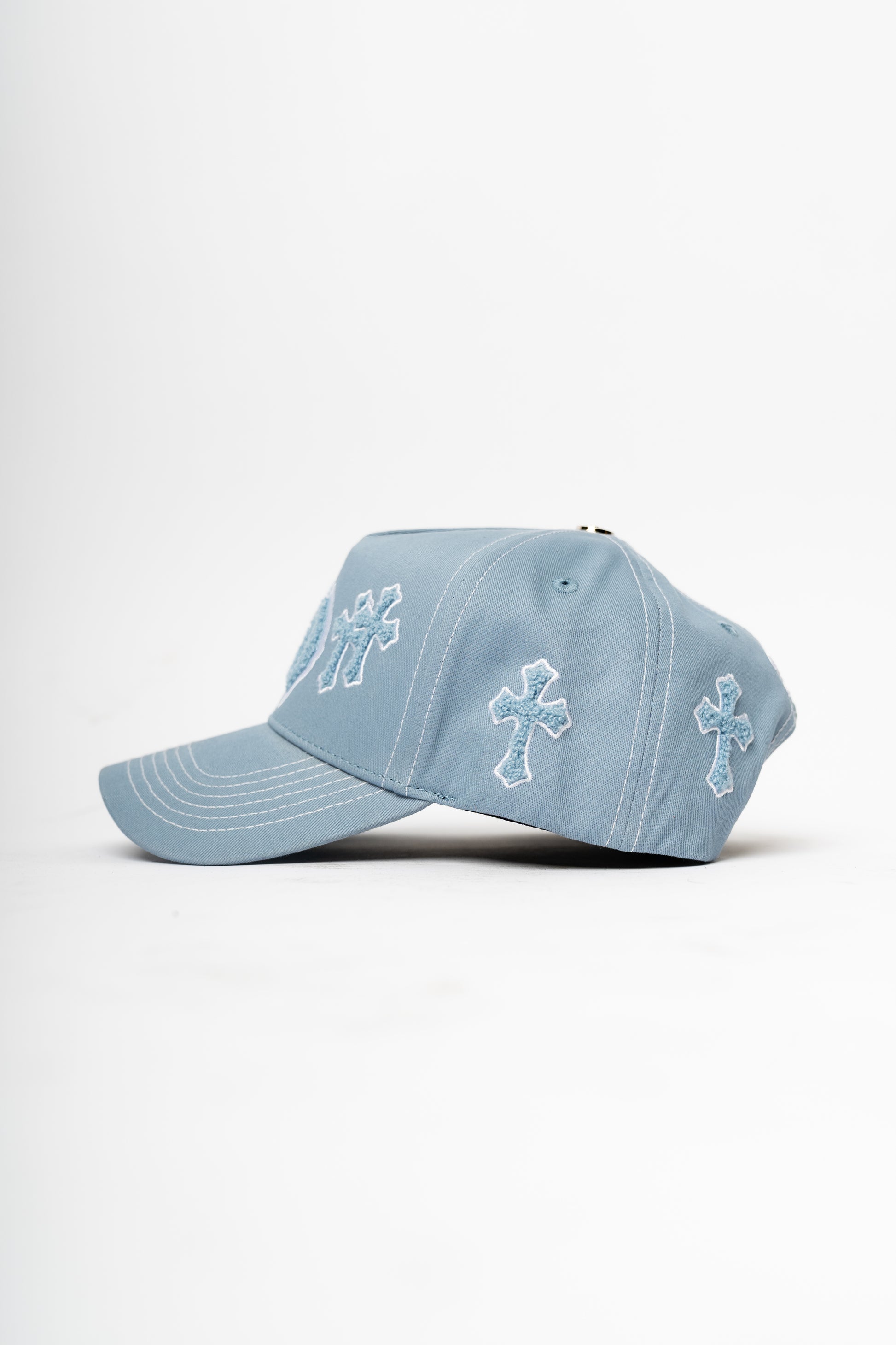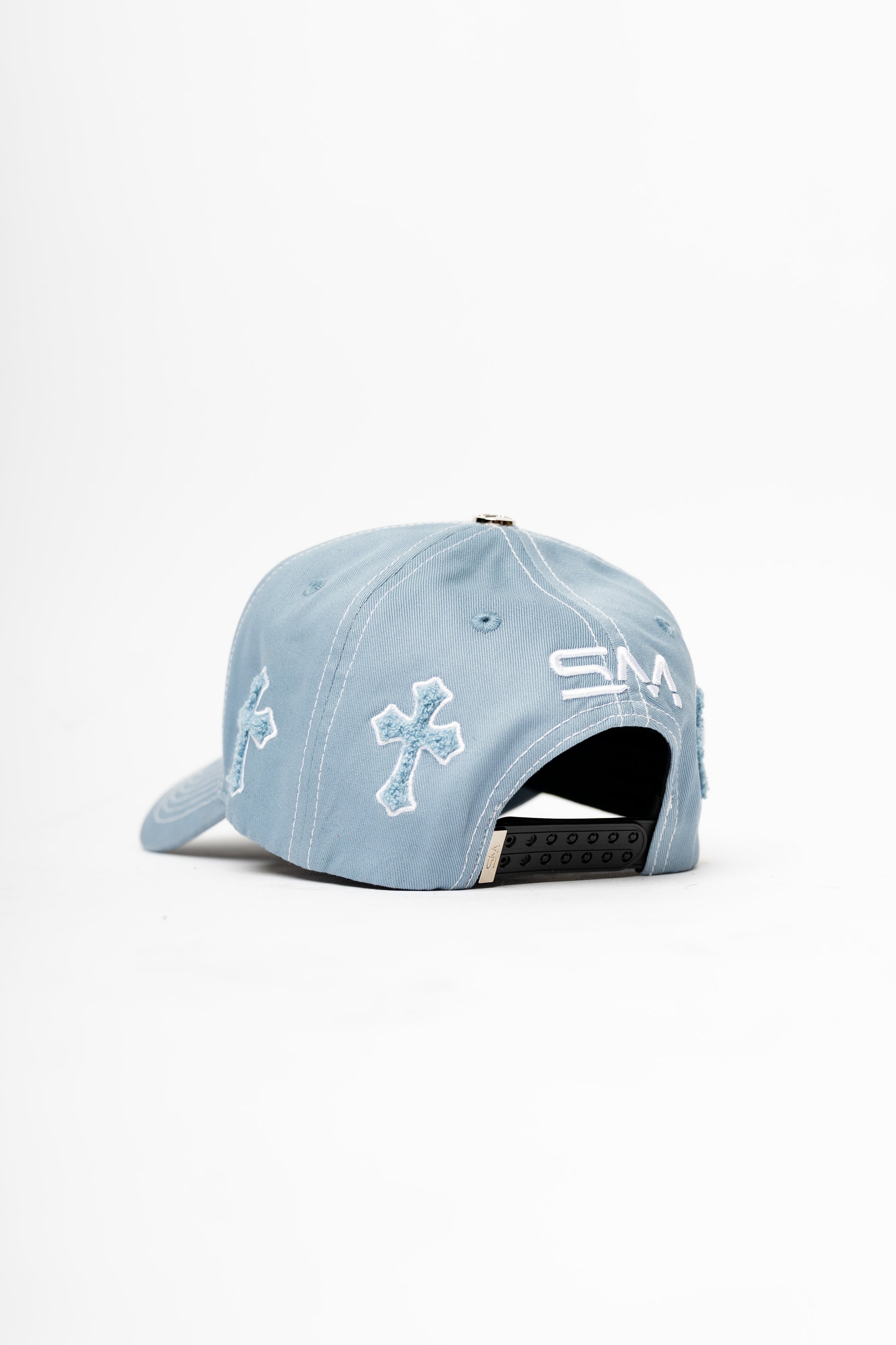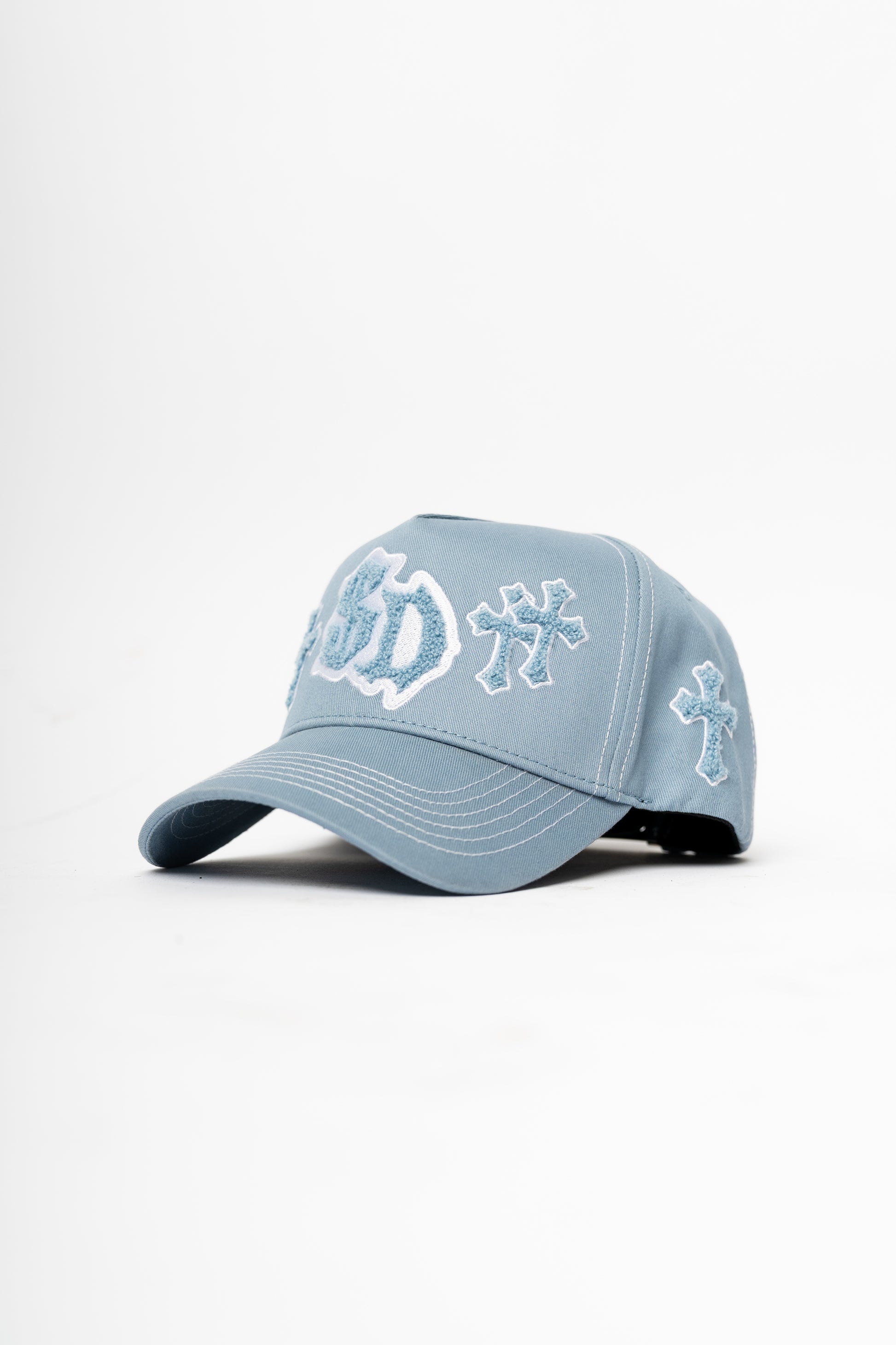 (BLUE COTTON CAP, CHENILLE EMBROIDERY & 3D EMBROIDERY, BLACK SATIN INTERIOR, LEATHER SM PATCH UNDER BRIM, DOUBLE ROW SNAPBACK, METAL SM TAG, METAL SM BUTTON)