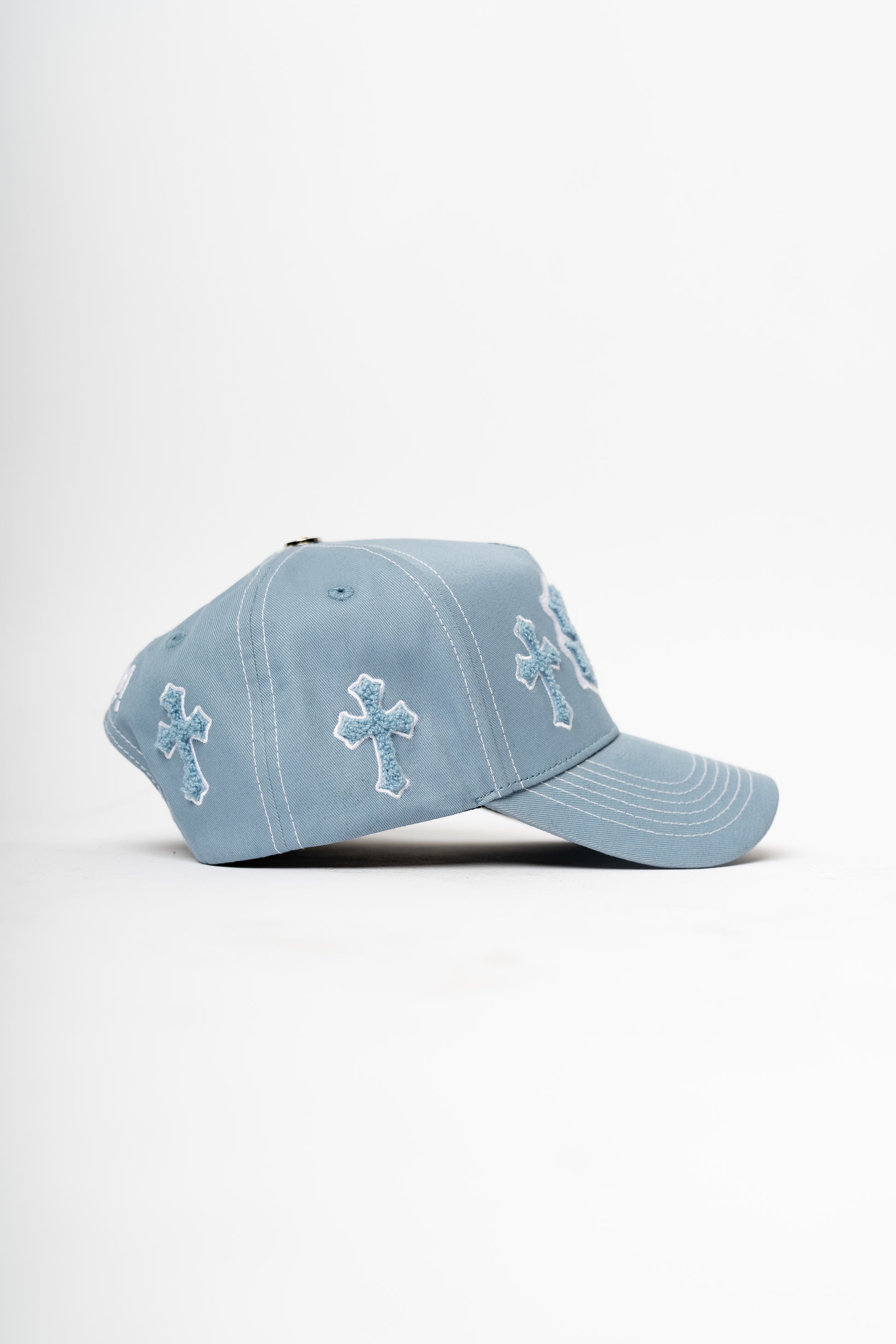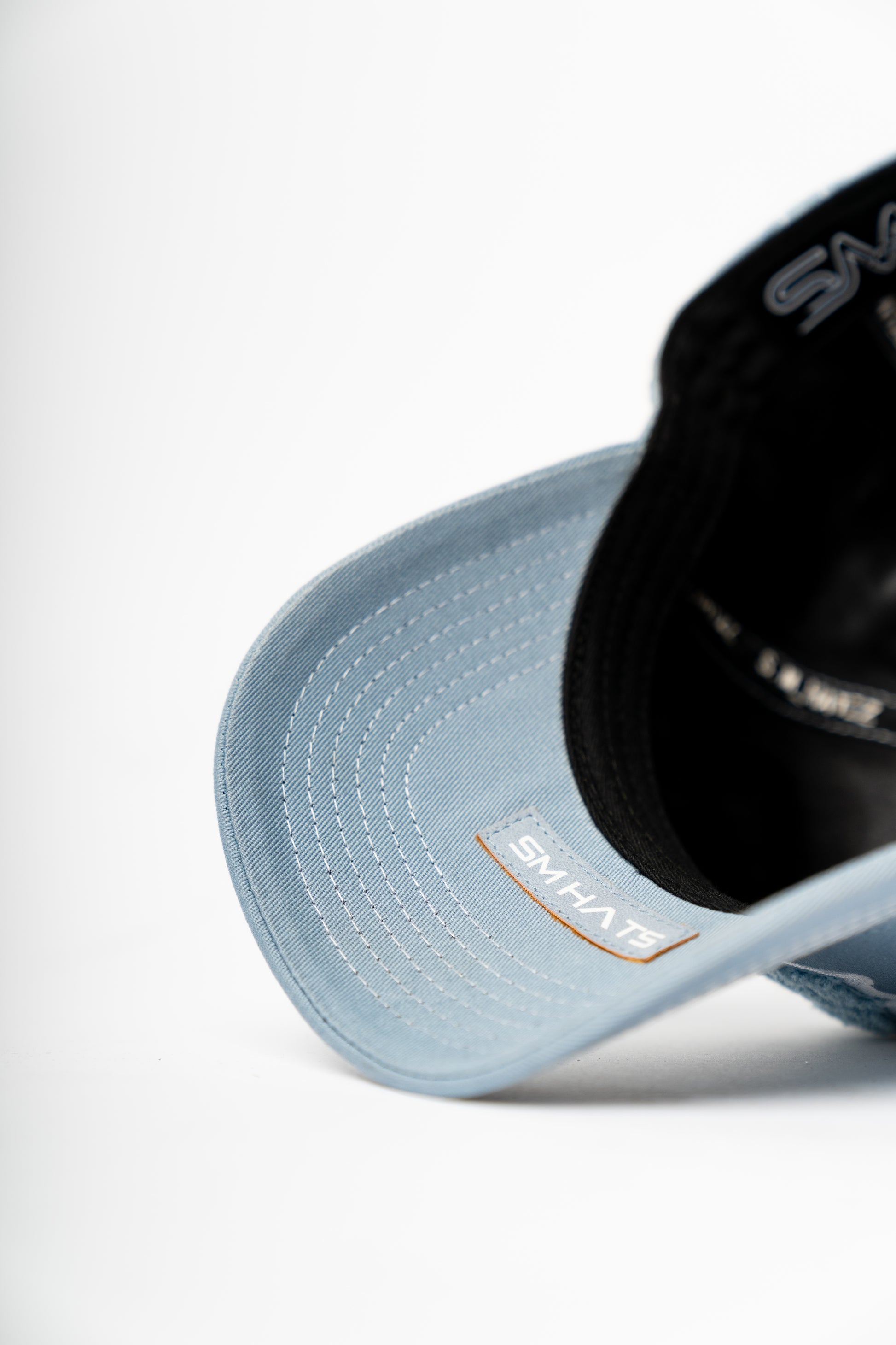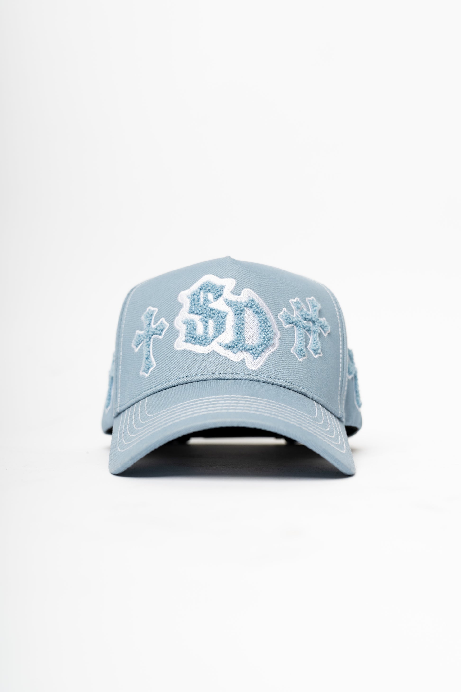 (BLUE COTTON CAP, CHENILLE EMBROIDERY & 3D EMBROIDERY, BLACK SATIN INTERIOR, LEATHER SM PATCH UNDER BRIM, DOUBLE ROW SNAPBACK, METAL SM TAG, METAL SM BUTTON)